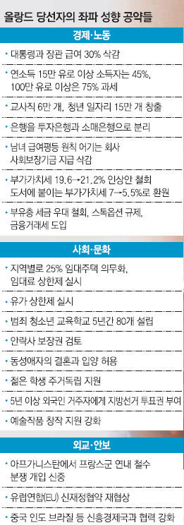 특히 금융, 경제 분야에서 ‘있는 자’를 겨냥한 정책이 많다. 연 15만 유로 이상 소득자는 최고세율이 45%로 올라가고 100만 유로 이상은 75%를 세금으로 걷겠다는 과세안이 대표적이다. 75%는 서방 세계에서 전례를 찾기 힘든 세율이다. 은행을 투자은행과 소매은행으로 분리하고 금융소득세를 높이겠다는 공약은 글로벌 금융위기의 주범이 은행과 헤지펀드의 과도한 투기 때문이라는 인식에서 비롯됐다. 금융거래세 도입안 역시 그런 연장선상에 있다. 상속세율을 높이고 대기업의 법인세 감면 혜택을 줄이겠다는 것도 가진 자가 더 많이 나눠야 한다는 ‘부자 증세’ 정책의 하나다. 유가상한제나 임대료 상한제 역시 시장의 논리보다는 서민을 겨냥한 것이다.
