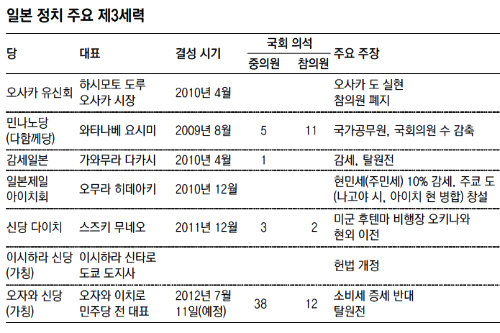 가와토 사다후미(川人貞史·정치학) 도쿄대 교수는 “현행 소선거구제도에서는 민주당과 자민당 2대 정당 외에는 의석을 얻기 어려운 구조다. 하지만 민주당이 자민당과 다를 바 없는 정책으로 전환했고 자민당에도 국민을 만족시킬 새로운 정책이 없다”고 지적했다. 양대 정당의 대립축이 사라졌기 때문에 제3세력의 공간이 커지고 있다는 것이다.