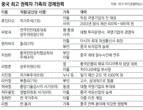 권력 서열 1위인 후진타오(胡錦濤) 국가주석의 아들 하이펑(海峰)은 공항 보안검색기 등 중국 보안장비 시장의 90%를 장악한 국영 독점기업 등 21개 회사를 가진 그룹의 전 대표. 이 회사는 유럽연합(EU)과 나미비아 필리핀 남아프리카공화국에서 불공정거래 혐의를 받았다. 2009년 영국 BBC방송은 후 사장이 나미비아 뇌물 사건에 연관됐을 개연성이 있다고 보도했다. 후 주석의 딸 하이칭(海淸)은 2003년 중국의 대표적 포털사이트이자 나스닥 상장사인 시나닷컴 최고경영자(CEO)를 지낸 대니얼 마오와 결혼했다. 당시 재산이 3500만∼6000만 달러(약 400억∼685억 원)에 이른 것으로 알려졌다.