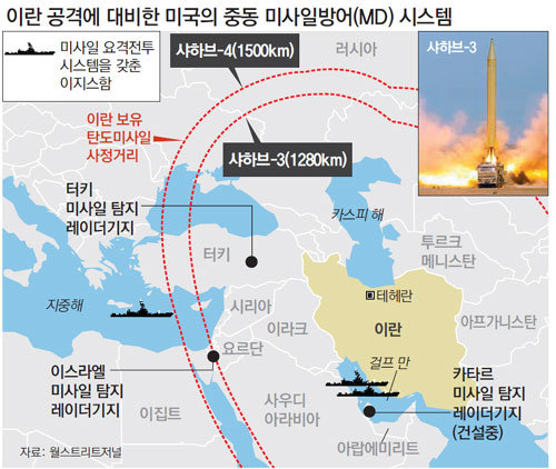 미국은 또 이란의 미사일 공격에 대비해 7월 말 카타르 외곽에 중동의 세 번째 미사일방어(MD) 레이더기지를 완공할 예정이라고 월스트리트저널이 17일 전했다. 현재 미국은 이스라엘과 터키에 MD 레이더기지를 운영하고 있다. 신설되는 기지는 탄도미사일 요격 시스템까지 갖춰 걸프 만과 지중해에 배치된 이지스함과 더불어 이란의 탄도미사일을 직접 요격할 수 있다. 미 고위 관리는 “중동에 세 번째 기지가 만들어지면 이란의 탄도 미사일 공격을 막을 ‘방어 우산’, ‘방어 돔’의 골격이 구축되는 것”이라고 설명했다.