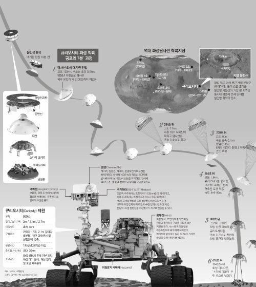 미국 항공우주국(NASA)이 25억 달러(약 2조8250억 원)를 들여 제작한 탐사로봇 ‘큐리오시티(Curiosity)’가 6일 오후 2시 31분(한국 시간) 화성 게일 분화구에 착륙한다. 이 로봇은 687일 동안 화성에 머물면서 화성이 과거 생명체가 살기에 적합한 환경이었는지 탐사한다. 큐리오시티는 물의 흔적 정도만 찾던 과거 탐사와 달리 미생물 등 생명체의 존재 가능성을 분석하는 임무를 띠고 있다. 이를 위해 2.1m까지 늘어나는 팔, 초정밀 카메라, 반경 7m 내 흙이나 바위를 태워 분석할 수 있는 레이저 등 최첨단 장비로 중무장했다.