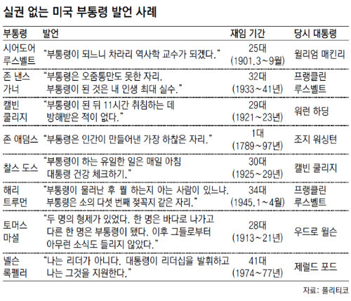 부통령이 얼마나 실속도 인기도 없는 자리인지는 역대 부통령들의 발언에서도 알 수 있다고 신문은 전했다. 초대 부통령을 지낸 존 애덤스는 “부통령은 인간이 만들어낸 가장 하찮은 자리”라고 말했을 정도로 부통령의 권력 부재를 건국 초기부터 꿰뚫고 있었다. 25대 부통령 시어도어 루스벨트는 “부통령이 아니라면 무슨 일이라도 하겠다”고 신세한탄을 했다. 정작 그는 윌리엄 매킨리 대통령이 암살되자 대통령 직을 승계하는 영광을 누렸다.
