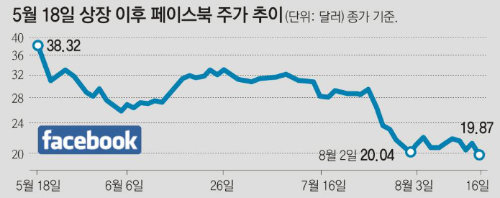 이로써 1040억 달러라는 사상 최대의 기업가치로 증시에 등장한 페이스북의 시가총액은 16일 425억 달러로 절반 이상 줄었다. 페이스북 지분 24%를 보유한 마크 저커버그 최고경영자(CEO)의 주식 가치도 상장 당시 194달러에서 현재 99억 달러로 반 토막 났다.