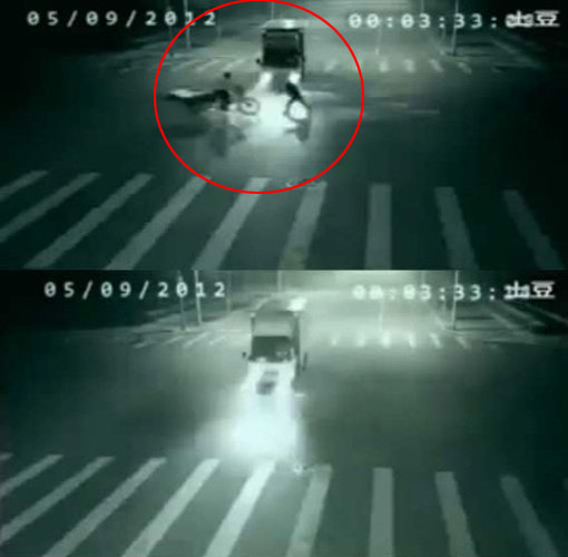 그런데 갑자기 빠른 속도로 또 다른 사람이 등장해 트럭과 부딪힐 뻔한 자전거 운전자를 반대편 차선으로 옮겨 놓는다.