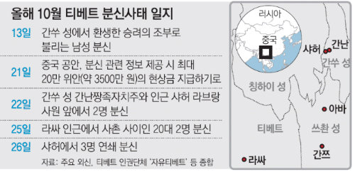 티베트의 독립을 외치며 지난해 3월 시작된 티베트인의 연쇄 분신(焚身) 항거가 갈수록 확산되고 있다. 최근까지 분신한 사람만 60여 명으로 한 달에 3명꼴이다. 특히 지난주에만 간쑤(甘肅) 성에서 7명이 분신해 한 주간 최대 기록을 세웠다.