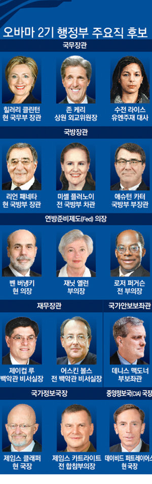 버락 오바마 2기 행정부 구성의 최대 관심사는 4년간 외교정책을 진두지휘한 힐러리 클린턴 국무장관(65)의 거취다. 그는 지난해부터 “오바마가 재선에 성공해도 나는 장관 자리에서 물러날 것”이라고 공언했다. 하지만 지난달 25일 월스트리트저널(WSJ)과의 인터뷰에서 “리비아 벵가지 주재 미 영사관 테러 사건을 마무리할 때까지 업무를 맡아야 할지도 모르겠다”고 말해 일말의 유임 가능성을 남겼다.