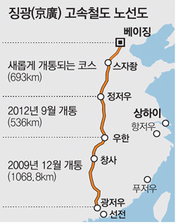 징광 고속철 노선은 크게 세 구간이다. 2009년 12월 우한∼광저우 구간(약 1068.8km)이 개통됐고, 올해 9월에는 정저우∼우한 구간(536km)이 개통됐다. 이번에 베이징∼정저우 구간(693km)이 개통되면서 전 노선이 이어졌다.