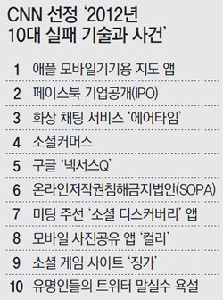 올해는 소셜미디어가 미국 대선에서 중요한 역할을 하고 태블릿PC 크기가 작아지는 등 첨단 정보기술(IT) 분야에서 괄목할 만한 성장을 이룬 한 해였다. 그러나 기술적 진전 속에서 실패작도 나오기 마련. CNN은 올해 IT 분야의 10대 실패 기술과 사건을 꼽았다.