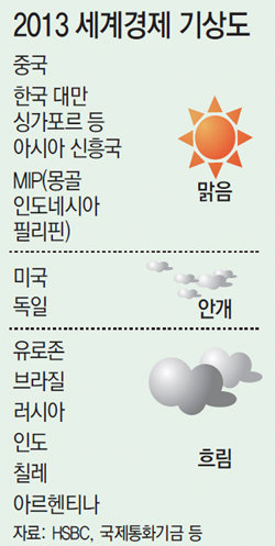 올해 한국 중국 대만 싱가포르 등 아시아 주요국은 성장세를 보이는 반면 재정위기 등에서 벗어나지 못하고 있는 유럽의 일부 국가는 마이너스 성장을 하는 등 ‘올해 경제 기상도’는 지역별로 뚜렷한 대조를 보일 것이라는 전망이 나왔다.