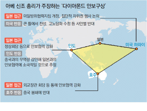 최근 일본 움직임의 핵심은 중국을 견제하는 것으로 모아진다. 이는 아베 총리가 취임 직후 구상을 밝힌 호주, 미국 하와이, 인도, 일본을 엮는 ‘다이아몬드 안전보장’과 일맥상통한다. 아베 총리가 16일 첫 해외 순방지로 베트남 하노이를 방문한 것도 중국 봉쇄를 위한 일본의 움직임이 빨라지는 것으로 일본 언론은 해석했다.