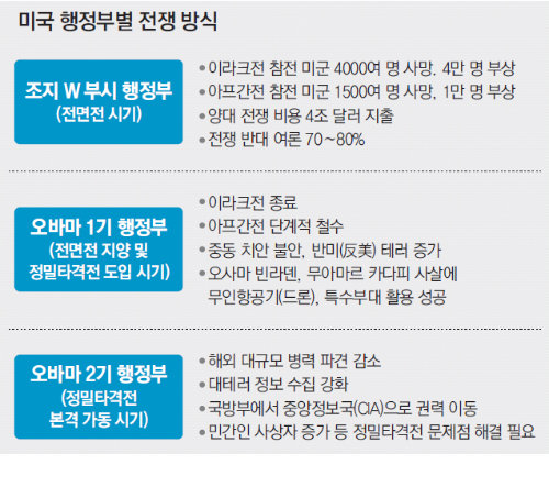 이 같은 문제점을 해결하기 위해 오바마 행정부가 2010년 이후 의욕적으로 추진하고 있는 것이 무인항공기(드론)와 특수부대를 활용한 ‘정밀 타격(surgical strike)’ 전쟁이다. 지난해 미국 군용기 10대 중 3대가 드론일 정도다. 미국은 현재 드론 7000대를 보유해 10년 전 50대에 비해 140배가 늘었다. 해외에 군인을 파병하면 1명당 연간 100만 달러(약 12억 원)가 들고 미국이 아프간전쟁에 쓴 예산은 연간 1200억 달러나 되지만 드론 유지비용은 1년에 50억∼100억 달러로 훨씬 경제적이다.