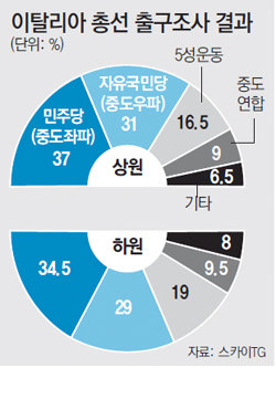 유로 위기의 재촉발 여부로 관심을 끌어온 이탈리아 총선 결과 경제 개혁을 지속하겠다고 공언한 중도 좌파 민주당이 예상대로 상·하원에서 제1당에 올랐다.