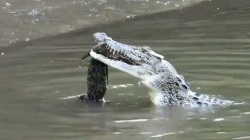 호주의 한 보트 관광업자가 퀸즐랜드 데인트리강에서 몸집이 큰 악어가 조그만 악어를 잡아먹는 장면을 카메라에 담아냈다.