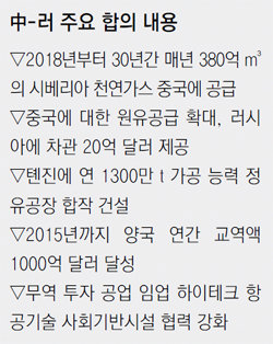 양국 정상은 이날 20년 가까이 타결하지 못했던 러시아의 대중국 천연가스 공급에 전격 합의했다. 두 정상이 지켜보는 가운데 러시아 국영가스회사인 가스프롬이 2018년부터 가스관을 통해 중국에 30년간 연간 380억 m³의 시베리아 천연가스를 공급하기로 중국석유천연가스그룹(CNPC)과 양해각서를 체결한 것. 연간 공급량은 향후 추가 협상 결과에 따라 600억 m³로 늘어날 수도 있다. 이는 중국의 지난해 천연가스 소비량 1400억 m³의 42%에 이른다. 시베리아 가스는 극동에서 중국 동북지역으로 수송된다. 러시아는 또 중국에 대한 원유 공급량을 지금의 연 1500만 t에서 3100만 t까지 늘리기로 했다. 양측은 이 밖에 30여 개 경제협력 문건에 줄줄이 ‘소나기 서명’을 했다.