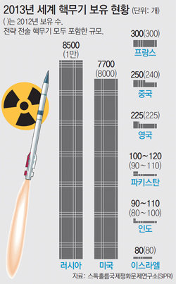 올 4월 말 기준으로 미국은 1654기, 러시아는 1480기의 전략핵무기를 보유하고 있다. 2018년까지 양국이 1550기로 줄이기로 한 2010년 신전략무기감축협정(START) 합의에 러시아는 이미 도달한 상태다.