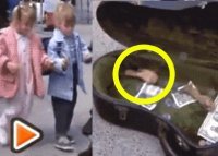 이때 한쪽에서 어린 아이 두 명이 다가오더니 동전 몇개와 지폐가 들어있는 악기 케이스에 후라이드 치킨을 넣고 간다.