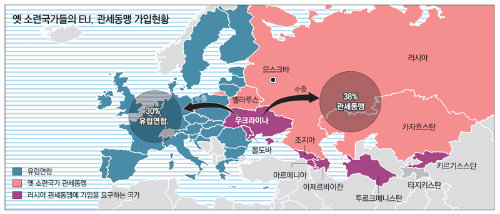 이러한 유럽의 동진은 러시아의 지정학적 패권주의를 자극했다. 러시아는 2010년 카자흐스탄, 벨라루스와 함께 출범시킨 ‘3국 관세동맹’의 확대를 밀어붙이고 있다. 2015년 옛 소련 국가들을 정치 경제적으로 통합하는 ‘유라시안 연합(EEU)’을 결성해 EU에 대항하겠다는 것이 블라디미르 푸틴 러시아 대통령의 꿈이다. 러시아는 탈(脫)러시아를 꿈꿨던 옛 소련 국가들을 상대로 군사, 에너지, 무역 보복을 통한 전방위 압박을 가하고 있다.