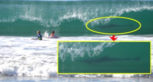 미국 허밍턴포스트에 따르면 파도 속 식인 상어는 준 에머슨이 로스엔젤레스 카운티 근교 맨해튼 비치에서 자신의 아들이 서핑을 즐기는 모습을 촬영하다 포착한 사진이라 설명했다.