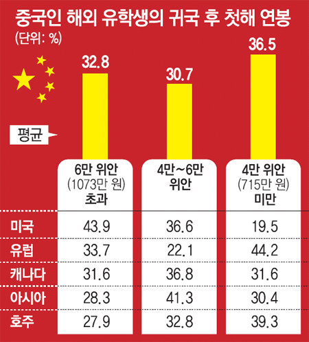 영국에서 석사학위를 따고 지난해 중국에 돌아온 재클린 구 씨(24)는 상하이(上海)의 한 변호사사무실에서 월급 3000위안(약 54만 원)짜리 일자리를 얻었다. 그나마 4개월간 50번 이상 이력서를 써낸 끝에 잡은 직장이다. 지금 연봉대로라면 8년이 돼야 유학비로 쓴 30만 위안(약 5400만 원)을 벌 수 있다.