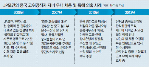 뉴욕타임스(NYT)는 9일 중국 고위층 자제의 채용비리 의혹과 관련해 JP모건이 연방수사 당국에 제출한 비밀 e메일 등에서 이런 사실이 밝혀졌다고 보도했다. e메일과 각종 수사당국의 조사 인터뷰에 따르면 제이미 다이먼 JP모건체이스 CEO 겸 회장은 2012년 6월 뉴욕 맨해튼 본사에서 샹쥔보(項俊波) 중국보험감독관리위원회 주석과 면담했다. 당시 샹 주석은 면담이 끝날 즈음 대동한 여성 통역사를 소개하며 “아주 가까운 친구의 딸이며 JP모건에 취업할 생각을 갖고 있다”고 했다. 그는 친구의 딸을 취업시키면 얻게 될 혜택을 강조했으며 통역사는 자신을 언급하는 내용을 통역하는 터무니없는 상황이 연출됐다고 NYT는 전했다.