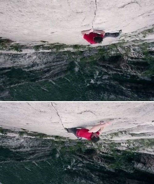 이 사진 속 남성은 미국 출신의 등반가 알렉스 하놀드이며, 맨손으로 암벽을 등반하는 ‘프리 솔로 클리아밍’에서 뛰어난 실력을 보유하고 있는 것으로 알려졌다.