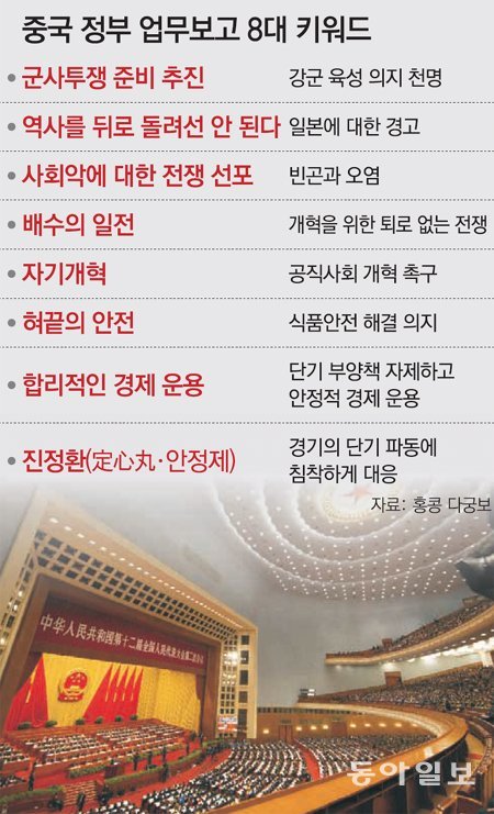6일 친중 매체인 홍콩 다궁(大公)보는 1만6985자에 이르는 업무보고에서 올해 정부의 국정기조를 관통하는 키워드 8개를 뽑아 소개했다. 상당수 표현이 과거보다 격해졌다. 집권 2년 차를 맞아 통치기반을 확고히 다지겠다는 시진핑(習近平) 정부의 의지가 반영됐다는 평가가 나온다.