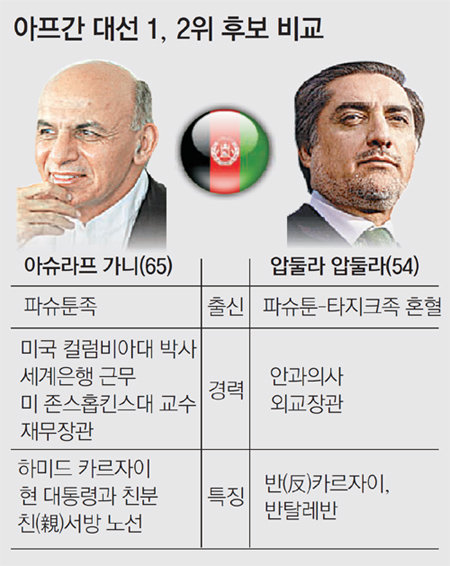 두 사람의 대결은 아프간 최대부족 파슈툰족(가니)과 2위 타지크족(압둘라)의 대결이라는 점에서도 관심을 끈다.
