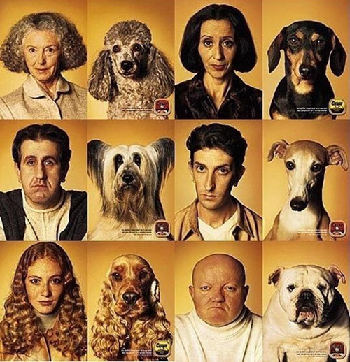 좌측에는 사람 우측에는 애완견으로 배열된 사진을 살펴보면, 사람의 표정과 강아지의 표정이 매우 흡사하다.