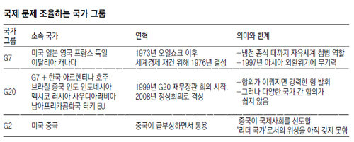 실제 1976년 결성된 주요 7개국(G7)은 1997년 아시아 외환위기에 대처하지 못하면서 사실상 ‘약발’을 잃었다. G7 대안으로 평가받는 주요 20개국(G20)은 2008년부터 정상회의로 격상되면서 위상이 높아졌지만 민감한 현안에 대한 합의를 끌어내기가 쉽지 않다는 것이 최대 단점이다. 지난해 9월 러시아에서 열린 G20 정상회의는 회원국들이 국제사회 최대 현안인 ‘시리아 문제’에 이견을 보이면서 아무런 결론을 내지 못했다.