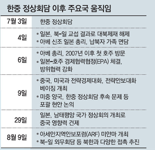 가장 기민하게 움직이는 쪽은 일본이다. 일본은 한중 정상회담 개최에 맞춰 4일 대북제재 해제안을 발표했다. 이에 앞서 1일 중국 베이징(北京)에서는 납북자 문제 논의를 위한 북-일 교섭을 진행했다. 아베 신조(安倍晋三) 일본 총리는 6∼12일 호주 방문에 이어 29일엔 남태평양 국가 정상회의를 개최해 아시아태평양 지역에서의 중국 영향력 견제 노력을 지속할 예정이다.