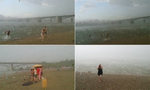 12일(현지 시간) 러시아 시베리아 서부 노보시비르스크 시의 한 강변에서 갑작스런 기온 변화로 우박이 쏟아지자 피서객들이 몸을 피하느라 우왕좌왕하는 모습이 카메라에 포착됐다. 이날 기온이 섭씨 40도에서 22도로 급격히 하강하며 세찬 비바람과 함께 우박이 우두둑 떨어졌다.