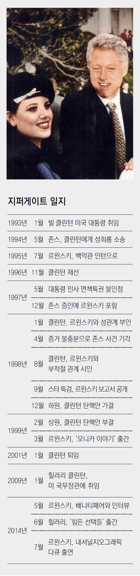 르윈스키는 지퍼게이트를 또 이용할 수 있을까. 그의 재등장에는 ‘돈과 명성을 다시 얻기 위해 일부러 나왔다’는 말이 꼬리를 문다. 지퍼게이트는 지금 시점에서 복기해 봐도 폭발력이 다 소진되지 않은 사건이다.