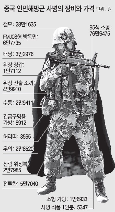 이 잡지가 병사들의 개인 전투장비 비용을 분석한 이유는 중국이 과감한 군비 증강 노력에도 불구하고 생명과 직결되는 개인 전투장비 개선에는 상대적으로 투자하지 않는 현실을 꼬집기 위해서다. 중국은 2008년 이후 군사비 지출이 미국에 이어 세계 2위를 차지하고 있다. 올해에도 지난해보다 880억 위안(약 15조6860억 원)이 늘어난 8082억 위안을 편성했다.