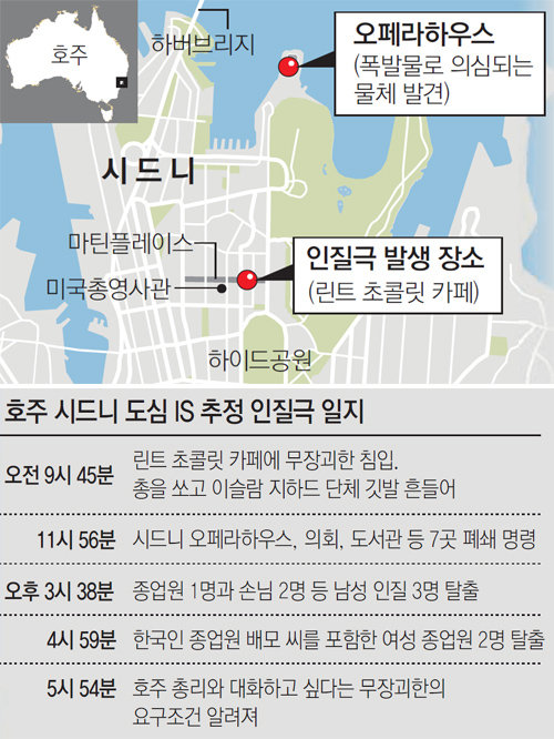 현지 방송 채널10은 “괴한이 IS의 깃발과 토니 애벗 호주 총리와의 면담 등 두 가지를 요구했다”고 보도했다. 범인이 린트 카페와 시드니 시내에 각각 2개의 폭탄을 설치했다고도 덧붙였다. 여성 인질이 올린 것으로 보이는 글도 소셜네트워크서비스(SNS)에 돌고 있다. 이 글에는 ‘괴한이 샷건과 폭탄을 갖고 있다. 요구를 들어주지 않으면 우릴 죽이겠다고 위협한다’는 내용이 담겼다.