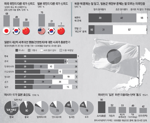 지난달 7일 미 여론조사전문기관 퓨리서치센터는 2차 대전 종전 70주년을 기념해 미국과 일본 국민 1000명을 대상으로 양국 간, 주변국에 대한 신뢰도를 조사했다. 그 결과 미국민의 68%가 ‘일본을 신뢰한다’고 답한 반면 ‘한국을 신뢰한다’고 말한 응답자는 절반이 안 되는 49%에 불과했다.