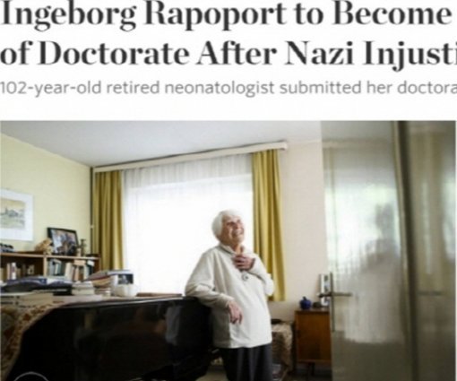 지난 14일(현지시각) 외신에 의하면 베를린에 사는 전직 신생아학자 잉게보르그 라포포트는 1938년 함부르크 대학에 제출했던 디프테리아 연구 논문을 최근 손질해 심사를 통과했다. 102세 최고령 박사의 탄생이다.