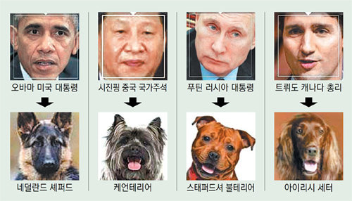 세계 각국 정상의 얼굴은 ‘어떤 개’를 닮았을까. 13일 워싱턴포스트(WP)는 마이크로소프트가 전날 선보인 새 애플리케이션 ‘페치(Fetch)’를 이용해 각 나라 대통령과 총리 등 정상을 닮은 개를 찾아내 소개했다.