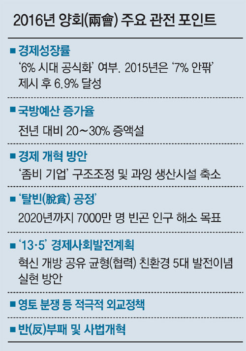 올해는 중국의 경제사회발전 13차 5개년(2016∼2020년) 규획(계획)이 시작되는 해로 이번 양회 기간 중 시진핑(習近平) 국가주석 집권 후반기 5년의 청사진도 제시된다. 특히 빈곤층 해소를 위한 이른바 ‘탈빈(脫貧) 공정’에 어떤 내용이 담길지 관심이 쏠린다. ‘좀비 기업’ 구조조정 및 과잉 생산시설 축소를 위한 방안도 제시될 것으로 보인다. 인력자원사회보장부가 최근 석탄과 철강 산업 구조조정으로 180만 명의 실업자가 발생할 것이라고 발표한 것도 그 일부다.