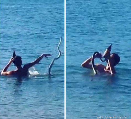 애완용 뱀과 수영을 즐기는 남자가 눈길을 끌고 있다. 이 남자는 강렬한 햇빛과 넘실거리는 파도를 즐긴다. 맥주로 보이는 음료를 마시며 바다 수영을 즐긴다. 남자는 혼자가 아니다. 뱀과 함께 수영을 만끽한다. 수영 도중 뱀에게 입을 맞추기도 한다. 이색적인 광경이 분명하다.