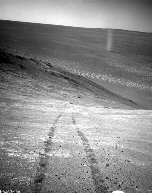 미국항공우주국이 최근에 공개한 이미지는 탐사로봇 오퍼튜니티가 자신이 온 길을 뒤돌아보면 촬영한 것이다. 황량하다. 아무도 없다. 그런데 무엇인가 오퍼튜니티를 향해서 온다. 회오리바람이다. 먼지를 일으키면서 서서히 가까워지고 있는 것 같다.