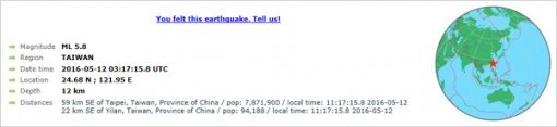 12일 대만 인근해역에서 규모 5.8의 지진이 발생했다. 타이베이 등에서도 건물이 흔들리는 등 강한 진동이 느껴졌다는 외신 보도도 이어졌다.