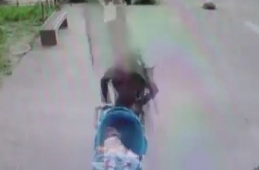 아기의 태운 유모차를 밀고 건물 안으로 들어가려던 러시아 여성이 위쪽에서 떨어진 네모난 콘크리트 판에 머리를 맞아 쓰러지는 안타까운 장면이 공개됐다.
