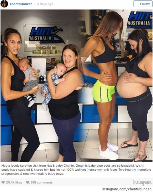 호주 미스 유니버스 결선 경력의 피트니스 모델, 숀텔 던컨이 화제의 주인공이다. 그녀는 출산 전, 너무나 작아 보이는 배로 언론에도 소개되는 등 화제와 논란을 낳은 바 있다. 숀텔 던컨은 임신 8개월에도 하루 4시간의 격한 운동을 하고 푸시업도 한다고 밝힌 바 있다.