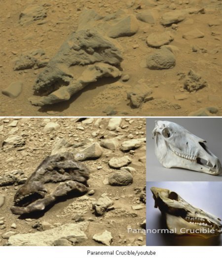 문제의 사진은 최근 해외 온라인 등을 통해 퍼지면서 네티즌들 사이에서 논란의 대상으로 떠올랐다. 이 사진은 NASA의 화성탐사로봇인 큐리어시티가 촬영한 것으로 전해진다. 얼핏 보면, 이 사진은 다른 사진들과 별 다를 것이 없어 보인다. 황량한 화성의 붉은 지표면이 보이고, 그 위에 암석들이 놓여 있다. 암석 하나의 모양새가 좀 이상(?)하다. 자세히 살펴보면, 문제의 암석은 먼 옛날, 지구에 살았던 공룡의 두개골과 매우 흡사하다.