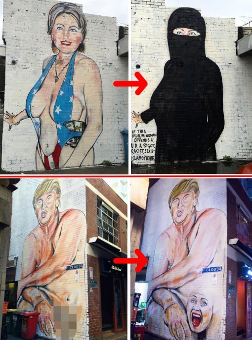 그는 새 작품을 다시 인스타그램에 올리며 “더 이상 모욕적이고 헐벗은 클린턴이 아니다. 이 무슬림 여성이 불쾌하다면 당신은 편견이 심한 성차별, 인종차별, 이슬람 혐오자다”라고 설명을 달았다.