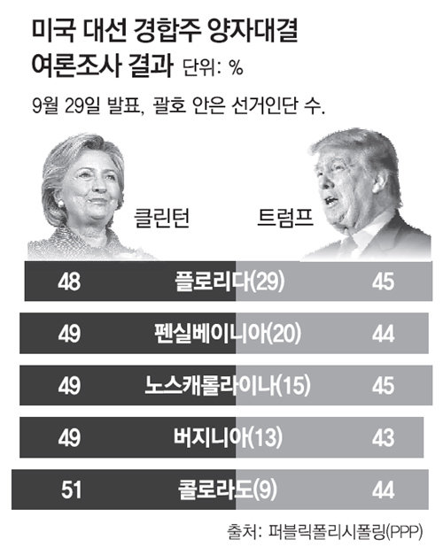 콜로라도(선거인단 9명)의 경우 클린턴은 51%의 지지율로 트럼프(44%)를 7%포인트 앞섰다. 플로리다(29명)에서도 클린턴 48%, 트럼프 45%로 3%포인트 차가 났다. 경합주 중 가장 경쟁이 치열한 노스캐롤라이나(15명) 펜실베이니아(20명)에서도 클린턴이 다시 앞서 나가기 시작했다.