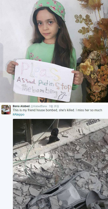 전장의 가녀린 울림 시리아의 일곱 살 소녀 알라베드가 ‘제발 아사드와 푸틴은 폭격을 멈춰주세요’라고