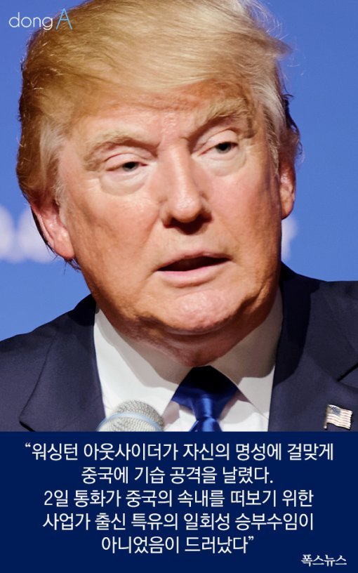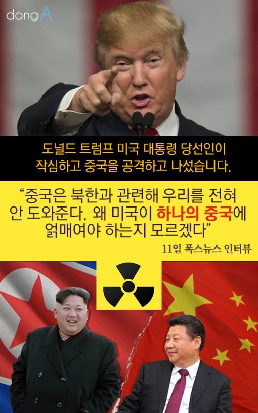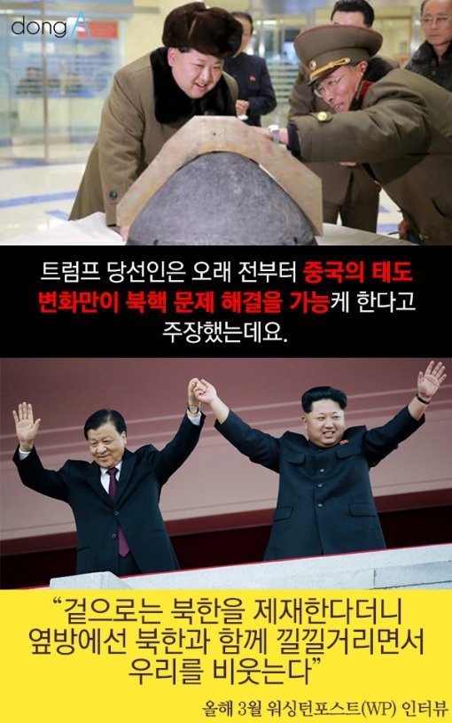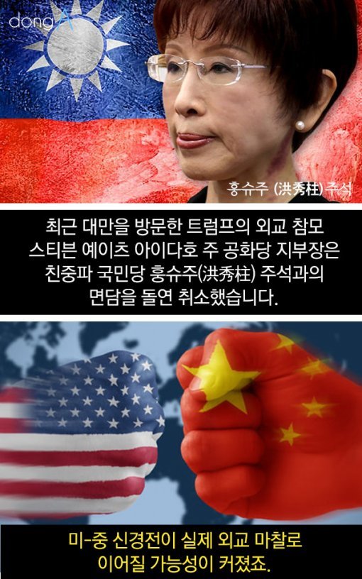 #05. 트럼프 당선인은 오래 전부터 중국의 태도 변화만이 북핵 문제 해결을 가능케 한다고 주장했는데요. "겉으로는 북한을 제재한다더니 옆방에선 북한과 함께 낄낄거리면서 우리를 비웃는다" 올해 3월 워싱턴포스트(WP) 인터뷰 #06. 최근 대만을 방문한 트럼프의 외교 참모 스티븐 예이츠 아이다호 주 공화당 지부장은 친중파 국민당 훙슈주(洪秀柱) 주석과의 면담을 돌연 취소했습니다. 미-중 신경전이 실제 외교 마찰로 이어질 가능성이 커졌죠.