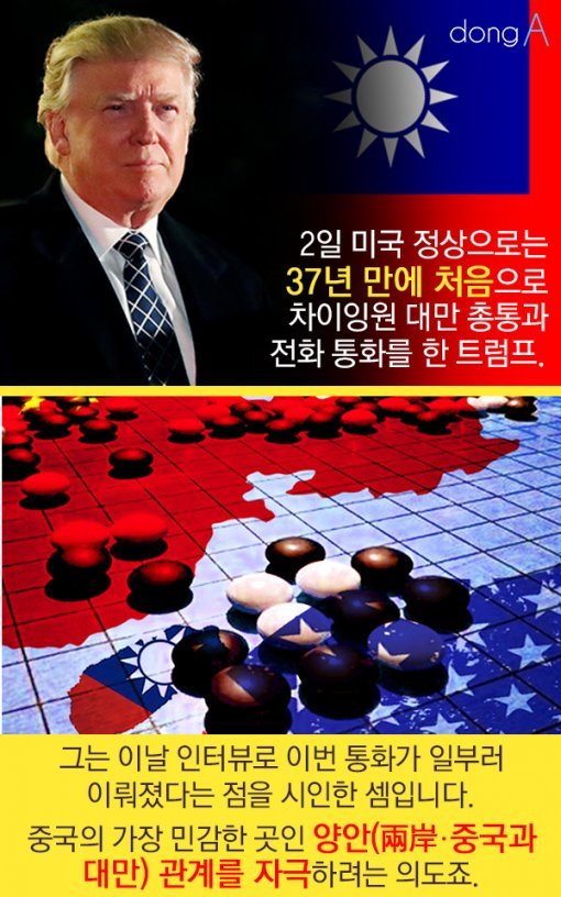 #03. 2일 미국 정상으로는 37년 만에 처음으로 차이잉원 대만 총통과 전화 통화를 한 트럼프. 그는 이날 인터뷰로 이번 통화가 일부러 이뤄졌다는 점을 시인한 셈입니다. 중국의 가장 민감한 곳인 양안(兩岸¤¤중국과 대만) 관계를 자극하려는 의도죠.