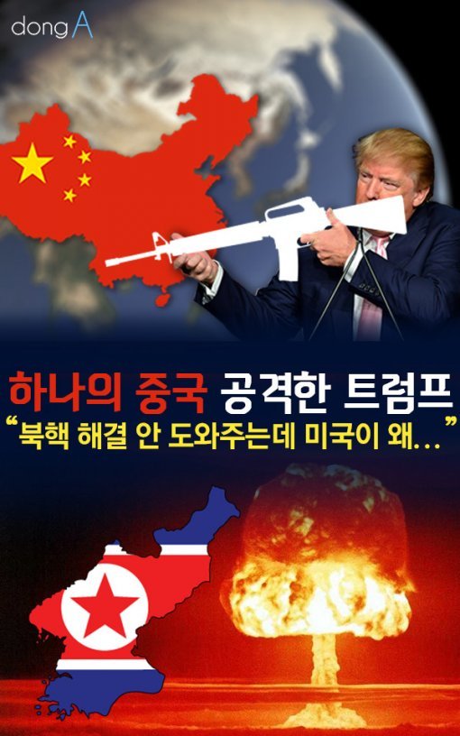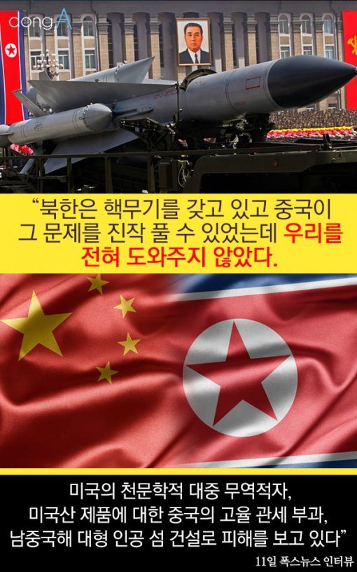 #04. "북한은 핵무기를 갖고 있고 중국이 그 문제를 진작 풀 수 있었는데 우리를 전혀 도와주지 않았다. 미국의 천문학적 대중 무역적자, 미국산 제품에 대한 중국의 고율 관세 부과, 남중국해 대형 인공 섬 건설로 피해를 보고 있다" 11일 폭스뉴스 인터뷰